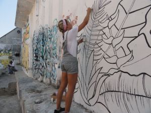 Wir treffen die Graphikdesignerin Simona, während sie eine Wand mit Motiven aus Amazonien bemalt.