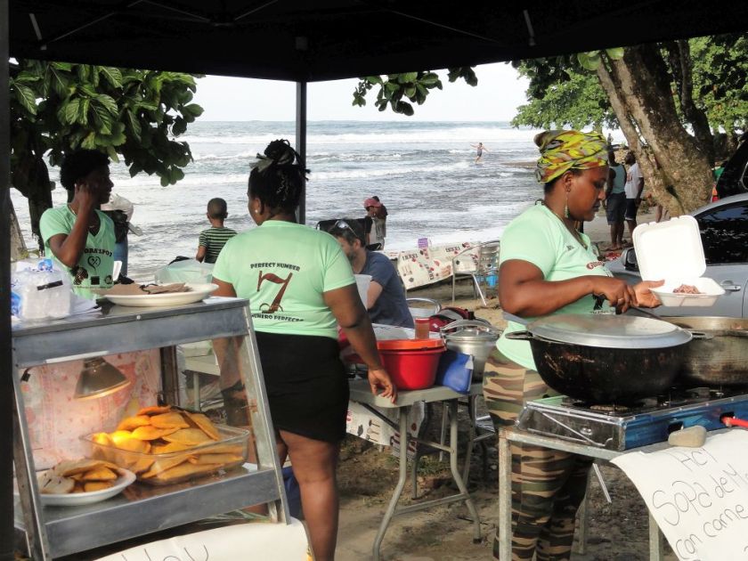 Großfamilien und Freundeskreise vergnügen sich im Schatten der Kokospalmen, ausgerüstet mit Kühltaschen, Grill und Lautsprecherboxen für die Calypsomusik. Vereinzelt bieten kleine Büdchen sowie ambulante Händler Kokosmilch, frittierte Teigtaschen, aber auch Surfbretter und Mieträder an.